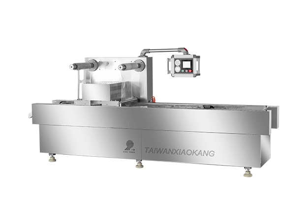 ,模具上升,在封口模具里將上膜附在托盤上,先抽真空(可根據(jù)用戶產(chǎn)品包裝要求,在抽象真空
